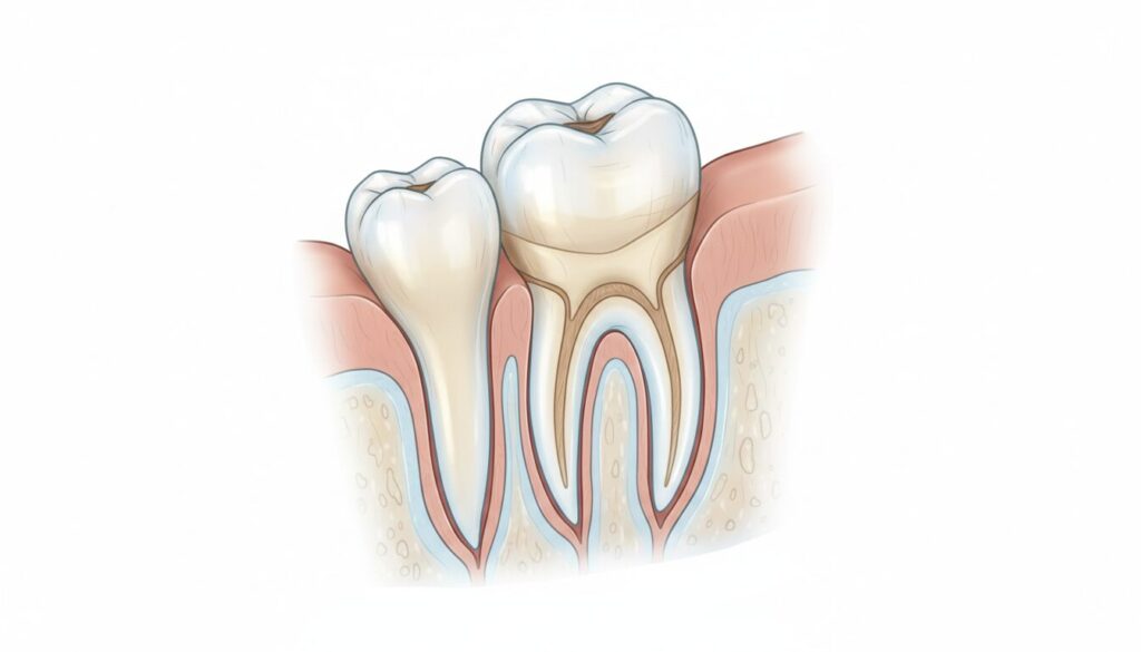 顎の骨と親知らずのスペース不足を示すイメージまた、周囲の組織の影響も考えられます。本来であれば歯は真っすぐ生えますが、顎の骨の形状や周囲の組織の状態によっては、本来とは異なる向きや角度で生えることがあるのです。